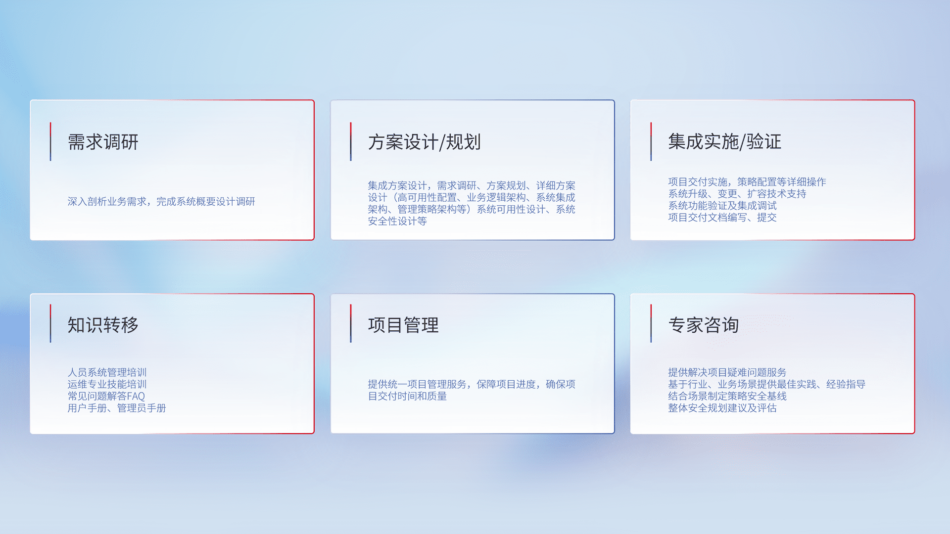 针对客户行业特性,,,,将宏观的安全战略和需求,,,通过专业的交付服务,,,,实现项目落地,,,,为客户提供标准规范的集成交付服务。。